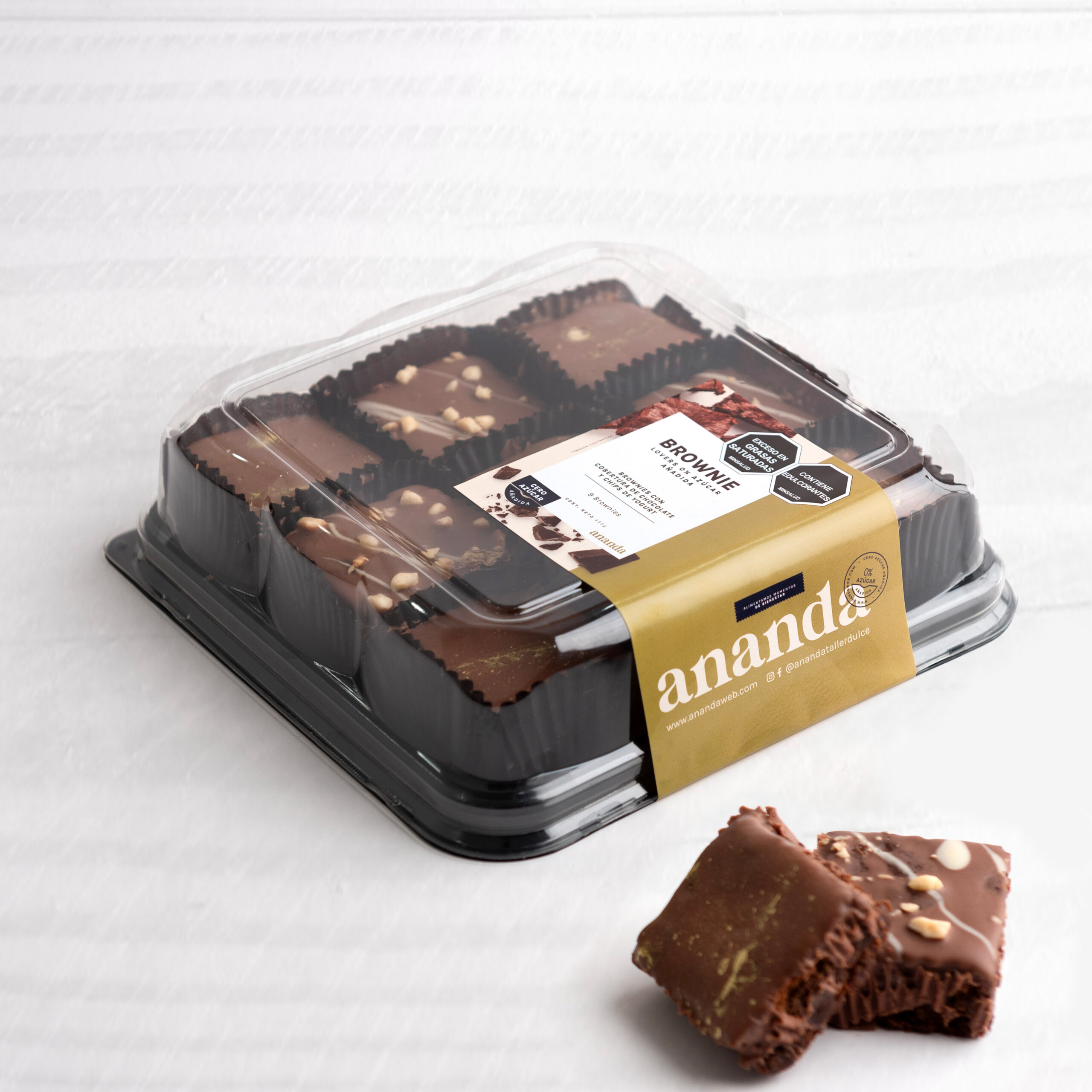 Deliciosos brownies 0% azúcar endulzados con stevia cubiertos de chocolate cero azúcar. 9 unidades.