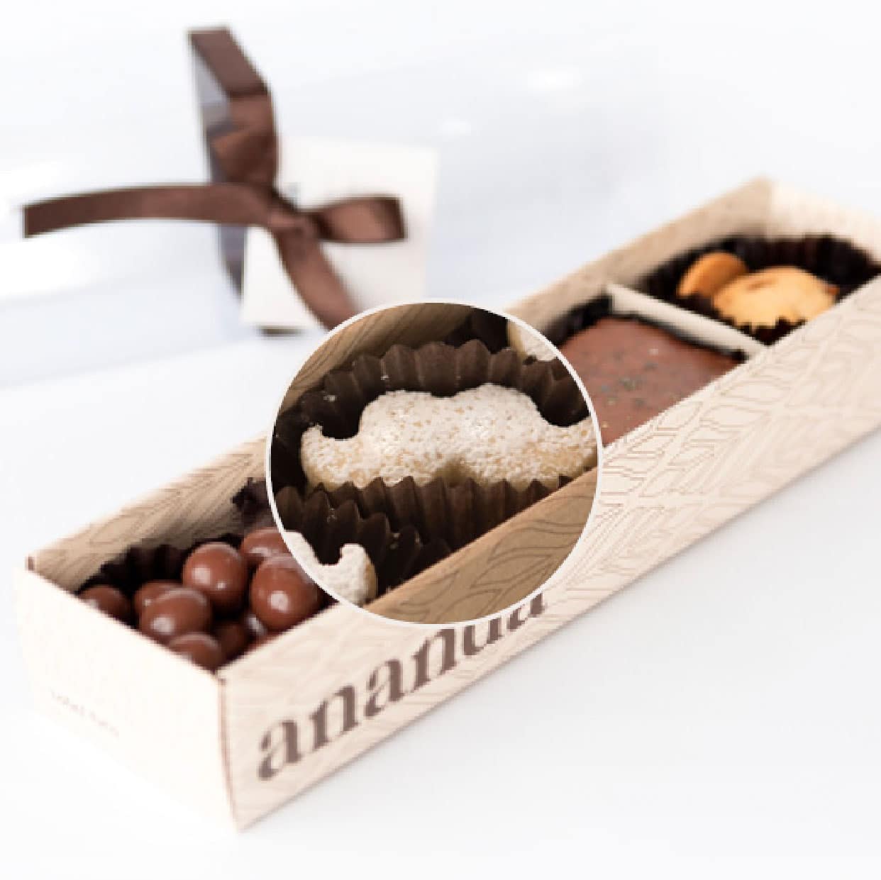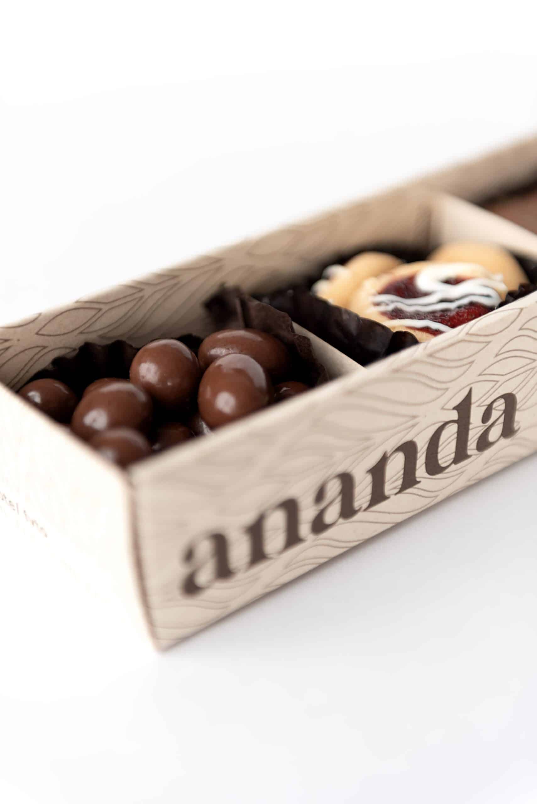 Incluye grageas de uvas pasas cubiertas de chocolate, un brownie sin azúcar, galletas de praliné de almendras y una bolsita con galletas de frutos rojos.