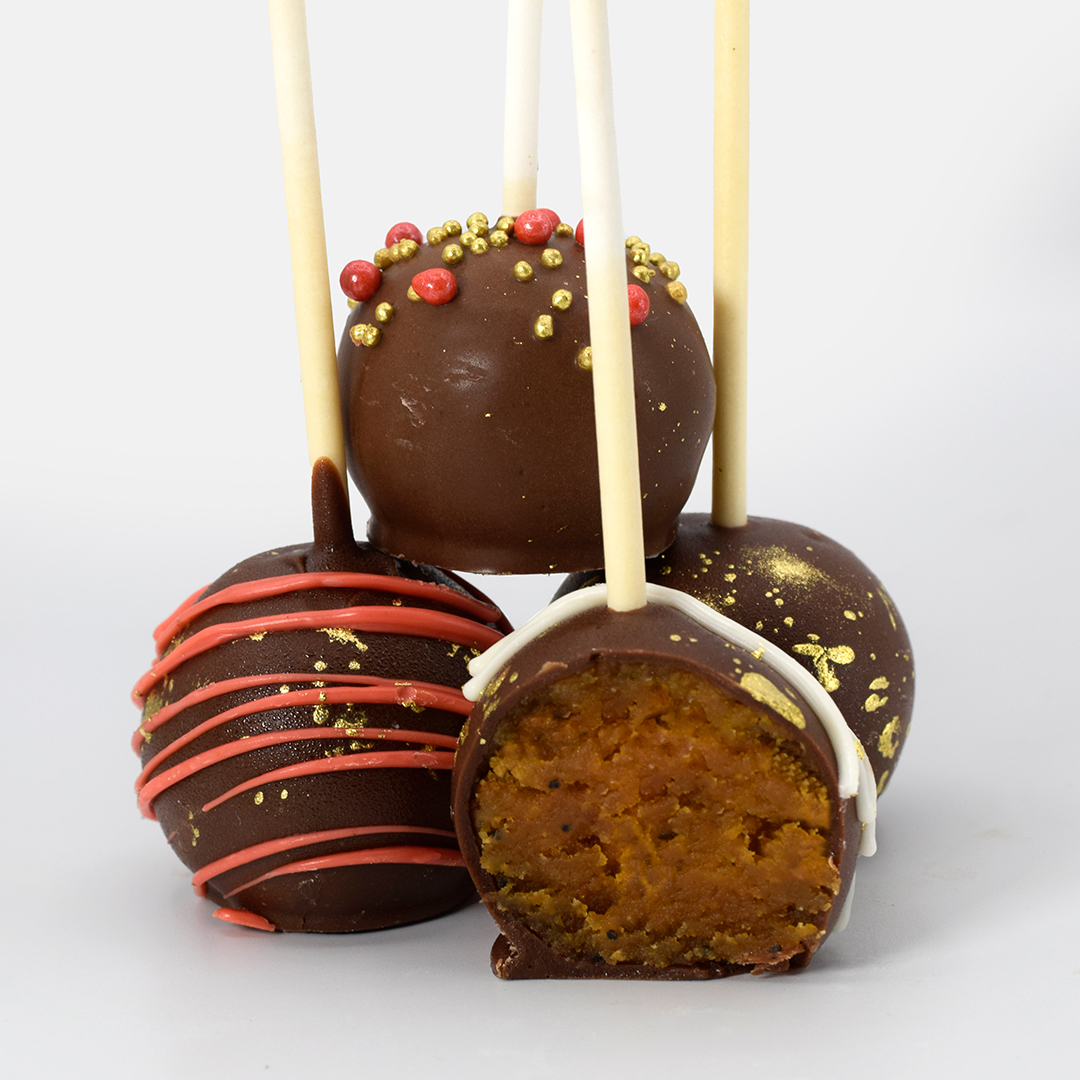 Mini pastelito de naranja cubierto de chocolate; una delicia de bocado que combina el sabor de un pastel con la diversión de un chupetín.