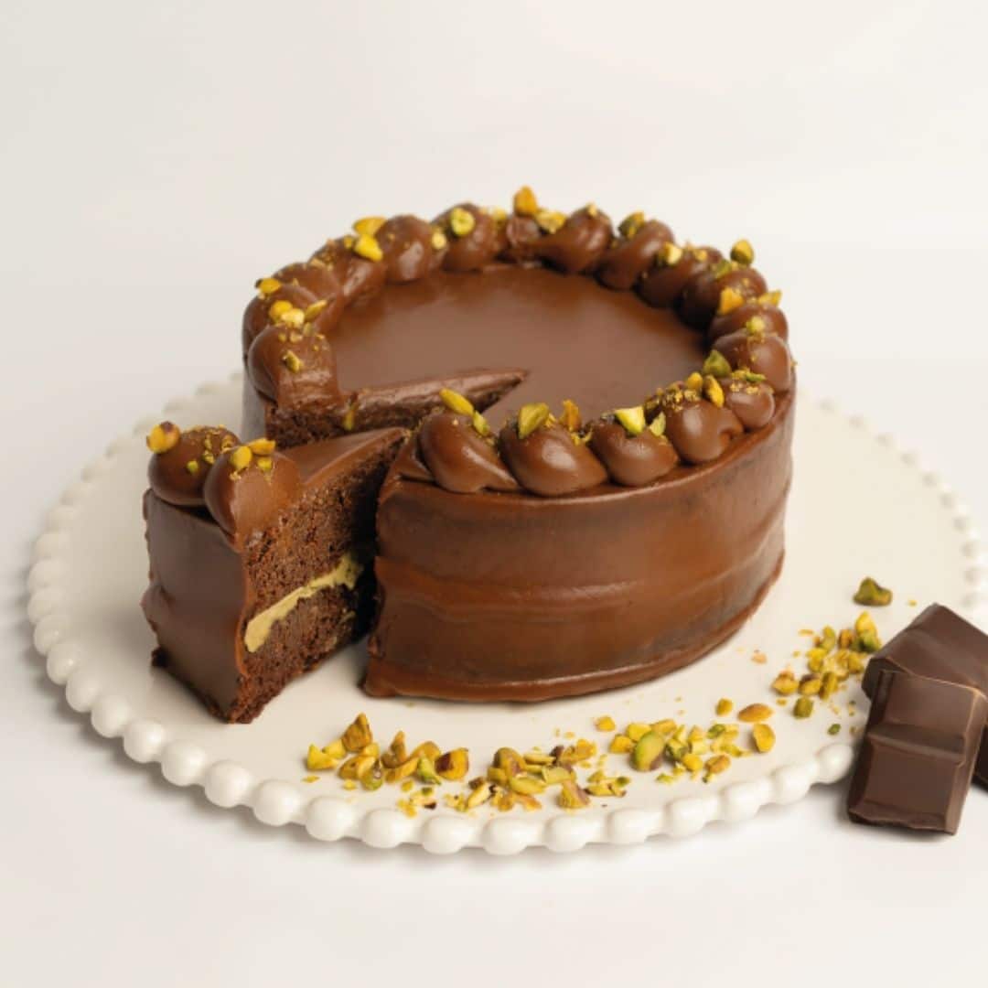 Delicada torta de chocolate y yogur, sin azúcar, cubierta con una suave ganache de pistacho.