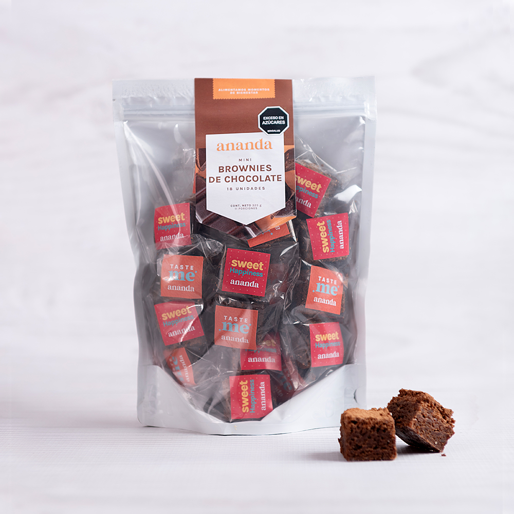 Deliciosos Mini Brownies de Chocolate empacados individualmente, el paquete incluye entre 16 y 18 unidades