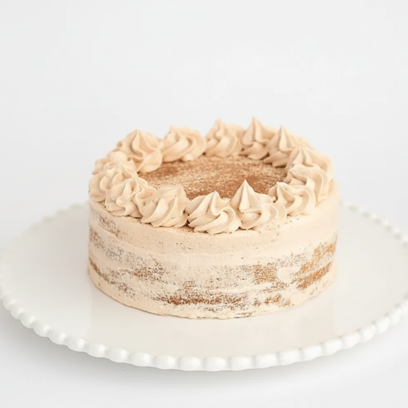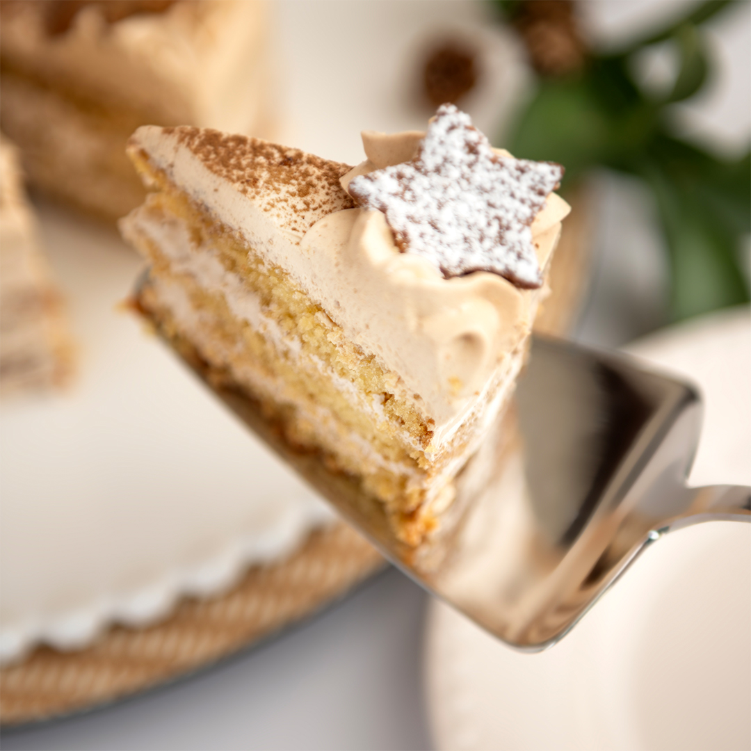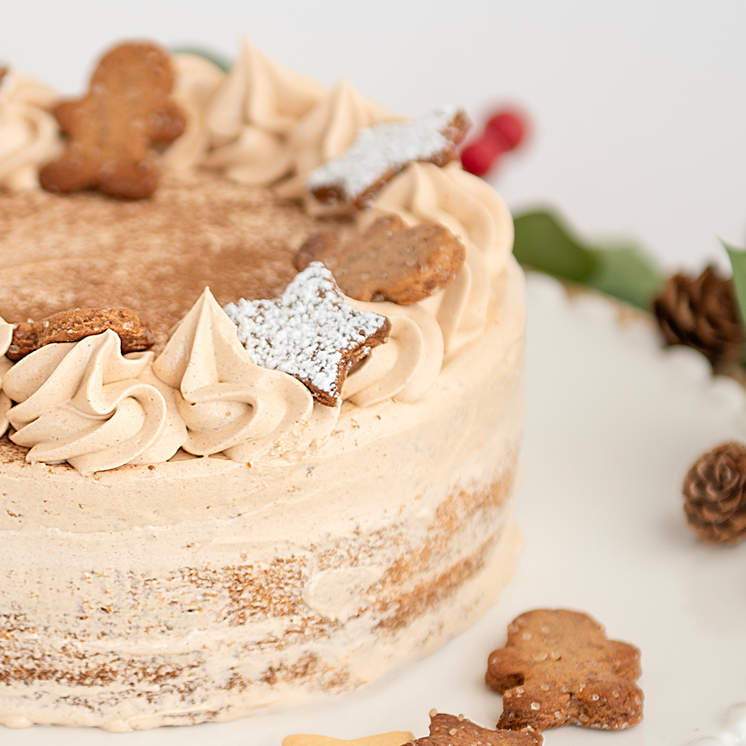 Suave torta de vainilla con especies navideñas (canela, jengibre y nuez moscada), cubierta con crujientes galletas.